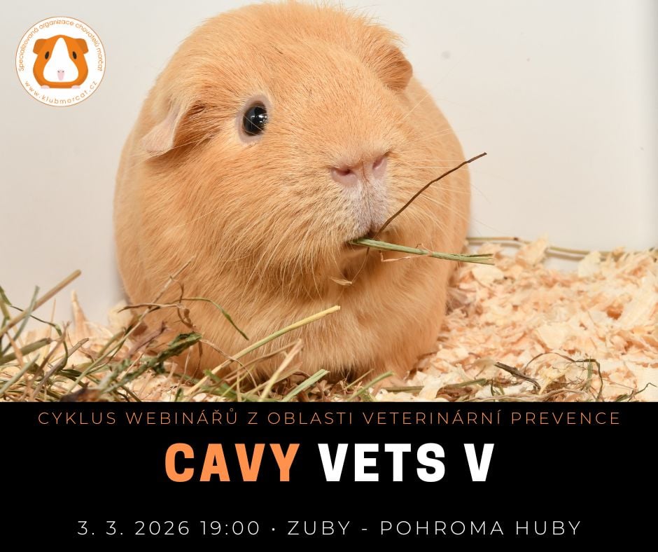 V úterý 3. března 2026 v 19:00 proběhne druhý ze série veterinárně-preventivních webinářů pro chovatele morčátek, pořádaný pod záštitou Specializované organizace chovatelů morčat (přihláška). Tentokrát se zaměříme na onemocnění zubů a dutiny ústní u morčat. Čeká vás krátký náhled do anatomie dutiny ústní morčete, dozvíte se, jak morče správně krmit a co dalšího udělat pro to, aby jeho zuby zůstaly zdravé a seznámíte se s nejčastějšími nemocemi zubů - přerůstáním řezáků a stoliček, podčelistními abscesy a syndromem saténových morčat. Na závěr vás čekají případy přímo z praxe a nebude chybět ani oblíbený test nabytých vědomostí.